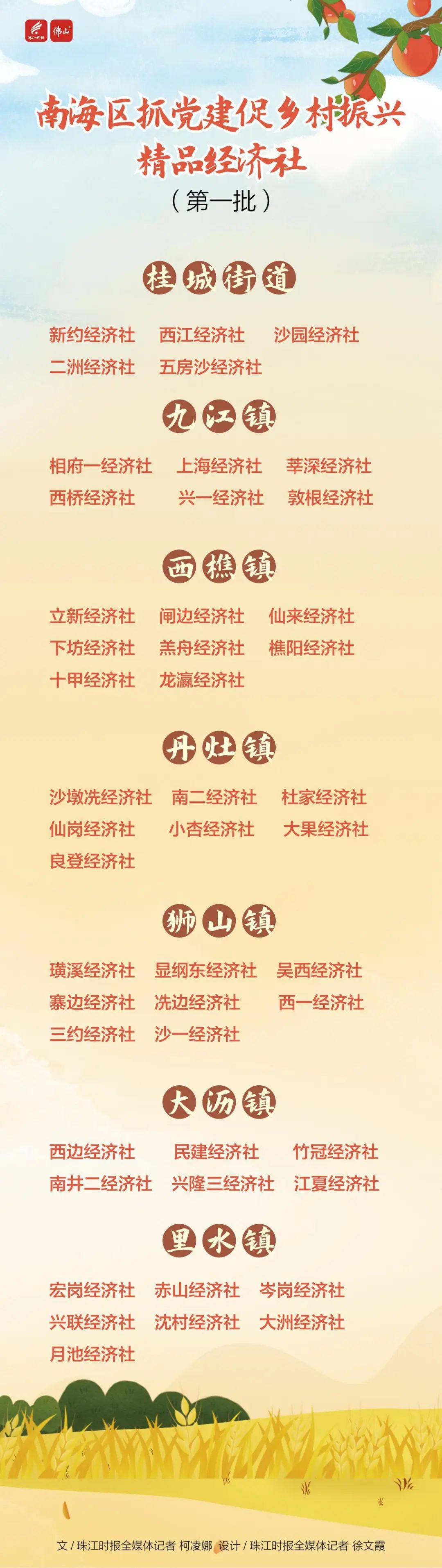 前期,南海区委组织部、区委农村工作办公室牵头评选南海区第一批抓党建促乡村振兴精品经济社,并于1月4日正式对外公布。桂城街道夏东社区二洲经济社、九江镇下西社区上海经济社、西樵镇太平社区十甲经济社、丹灶镇西城社区大果经济社、狮山镇吴屋村吴西经济社、大沥镇沥东社区江夏经济社、里水镇里水社区大洲经济社等47个经济社被评选为南海区第一批抓党建促乡村振兴精品经济社,这些经济社所在党支部可获得10万元经费支持。