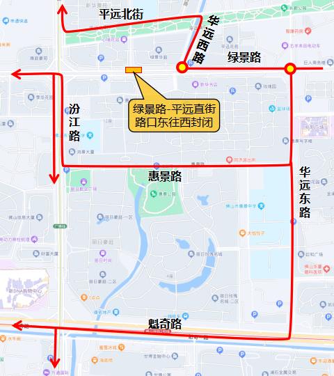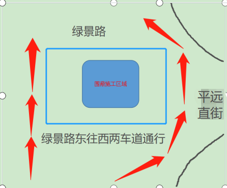 第一阶段:从1月9日起至1月10日17时,全封闭绿景路-平远直街路口东往西方向道路,途经车辆绕行路径指引如下:
