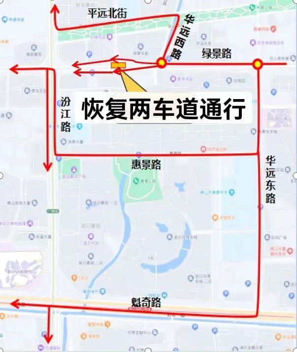 第二阶段:从1月10日17时起至1月15日,恢复绿景路-平远直街路口东往西两车道通行。