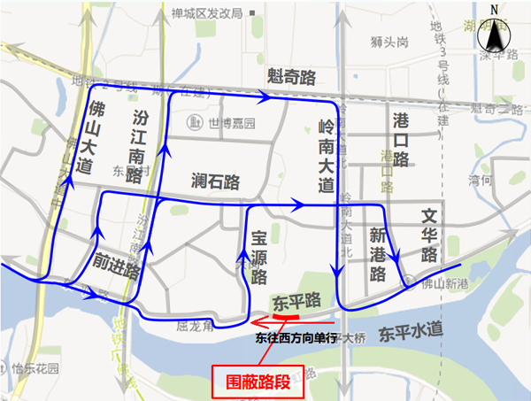 由于城市秀台景观建设项目施工需要,计划于2022年3月26日零时起至2022年7月26日止,对东平路(宝源路至岭南大道路段)局部进行施工围蔽,东平路(宝源路至岭南大道路段)调整为东往西方向单向通行。原东平路(宝源路-岭南大道段)西往东方向车辆需绕行澜石路、魁奇路等周边道路。