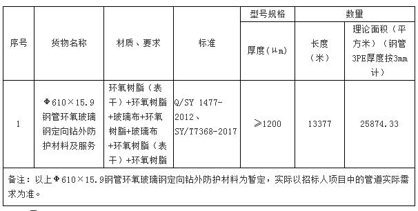 2.2 招标范围:招标内容包括:Ф610×15.9钢管定向钻外防护材料(长度:13377m,理论面积约25874.33m2)具体采购规格及数量如下表:
