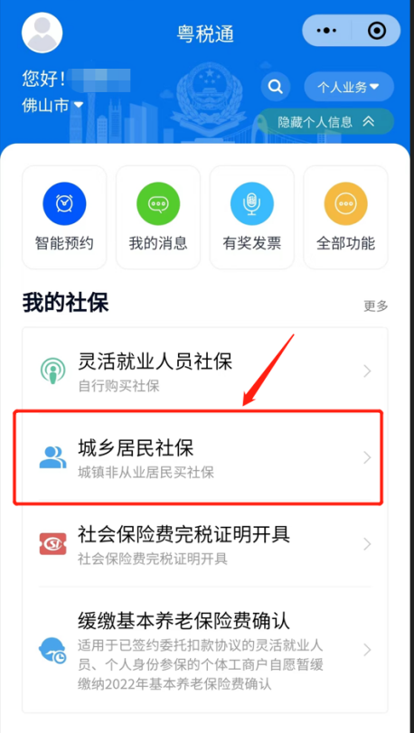 2.“粤税通”小程序实名认证登录后,在首页点击“城乡居民社保”。