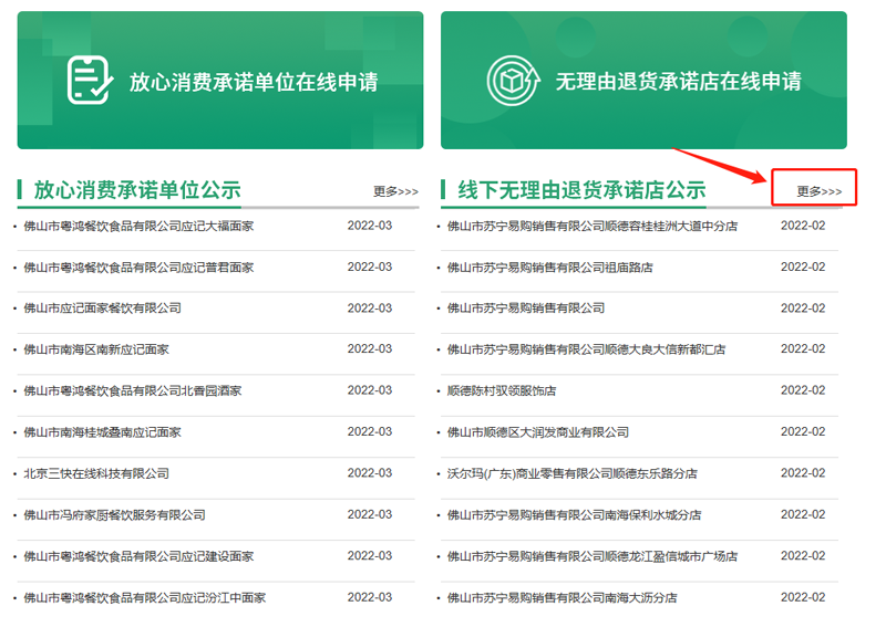 2.找到“线下无理由退货承诺店公示”,点击右侧的“更多>>>”。