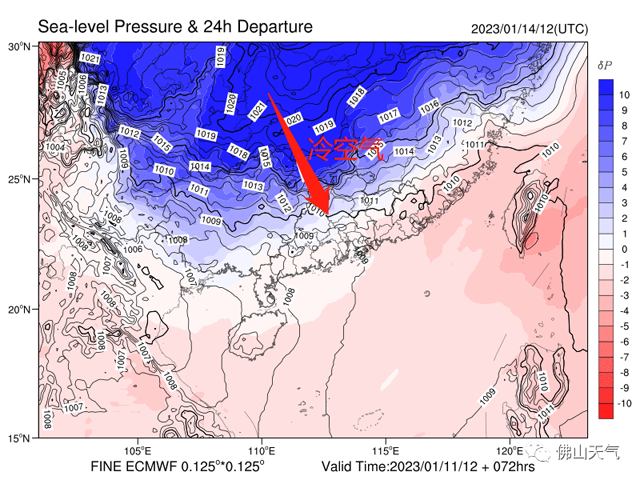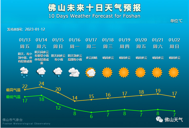 预计1月13-14日佛山阴雨天气持续,并伴有轻雾或雾;1月14日夜间起强冷空气自北向南影响佛山,北风加大,平均风力3~4级,阵风5~7级。气温持续下降,过程日平均气温下降8~10℃,过程最低气温出现在17日早晨,可降至6℃左右。