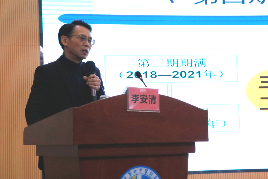 禅城区教育发展中心主任李安清以《名师引领促成长,奋楫扬帆又起航》作专题报告,对第四期教育人才培养梯队建设背景、梯队概况、梯队建设特点以及梯队建设工作建议作了具体阐释。