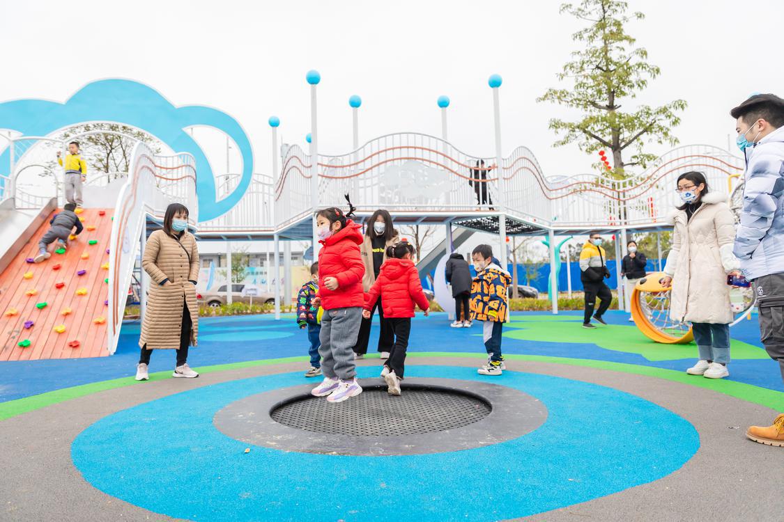 乐平镇齐家湖儿童公园内,家长正带着孩子们玩蹦床,其乐融融。