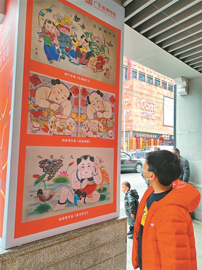 “广州饼印制作技艺”的金鱼形饼印,与年画《金玉满堂》里正在与玻璃鱼缸中的金鱼玩耍的胖娃娃组合,人财两旺、生活富足的朴实愿望扑面而来;威猛的醒狮前,是从年画里“走”出来的、挑着灯笼的孩子,一派活泼、欢欣的气象;广府插花制作技艺、广式硬木家具制作技艺相关的作品与天津杨柳青百年老年画《对格博古》对照,迎春时的精雅,“清供”里的文韵清新流露……记者看到,每个橱窗里的年画虽然来自不同的地方,但与旁边的广府年俗结合起来,那些二维平面上的古老图像,仿佛一下子跳到了三维空间中,让人们对年俗中蕴藏的世情百态,有了更深入的认知。