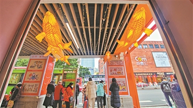 在这斑斓的色彩之间,展览“行花街,看年画,赏非遗”悄然亮相。展览以传统中国年中象征吉祥好运的“桔”为主色调,以广府年俗作为内容铺垫,通过“有镬气”“时光雕琢者”“吐故纳新”“盆满钵满”一系列主题橱窗,令繁忙的马路,变成流动的秀场。那些巧妙设计的小场景,一路引导观众沉浸式体验熟悉的年味。广府人乐观向上的精气神以及独特的审美意趣,在这别致的“行花街”中展现无遗。