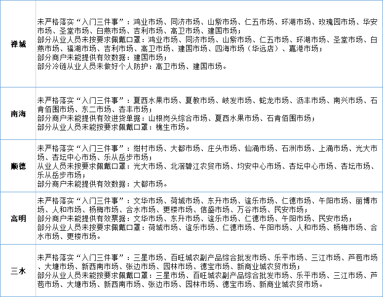 市场内部分从业人员未按要求佩戴口罩的市场有39家,其中,禅城13家、南海1家、顺德6家、高明8家、三水11家。