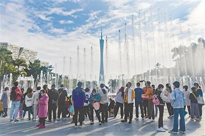 花城广场被称为广州的城市客厅,春节前夕,广场上的音乐喷泉表演吸引了数百位市民前来观看。