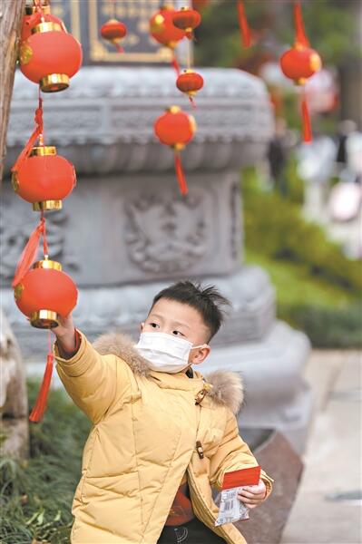 北京路的红灯笼在风中摇曳,玩耍的孩子像在追逐春天。
