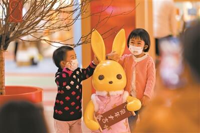 新春氛围已悄然上线,天真可爱的孩子们和兔子玩偶一同玩耍。