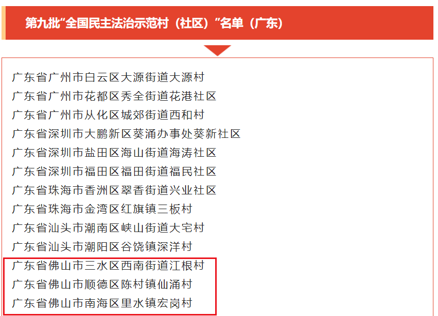 近日,司法部、民政部印发了《关于命名第九批“全国民主法治示范村(社区)”的决定》,决定命名1136个村(社区)为第九批“全国民主法治示范村(社区)”。其中,佛山市有3个村(社区)入选!