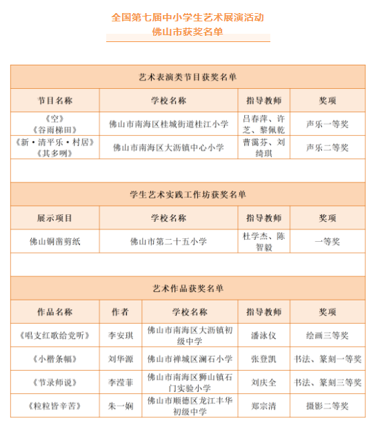 日前,全国第七届中小学生艺术展演活动优秀组织奖及各项目评选结果公示。佛山报送的作品获得7个奖项,其中,南海区桂城街道桂江小学的节目《空》《谷雨梯田》获得声乐一等奖,佛山市第二十五小学展示的项目佛山铜凿剪纸获得学生艺术实践工作坊一等奖,禅城区澜石小学刘华源的作品《小楷条幅》获得书法、篆刻一等奖。