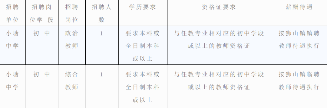 本次招聘岗位共2个(初中政治镇聘教师1名,初中综合代课教师1名)。