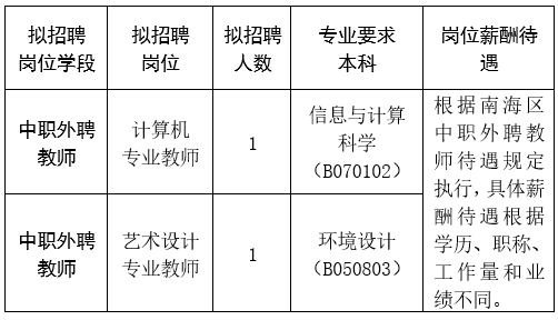 报名所需材料:《南海区教育系统公办学校招聘编外教师报名表》、近期免冠一寸彩色照片、本人身份证、毕业证、学位证、职称证及相关资历证明复印件。(报名材料以电子形式进行报送,报送邮箱:415256759@qq.com,资格审核通过后,原件于考试前核查)