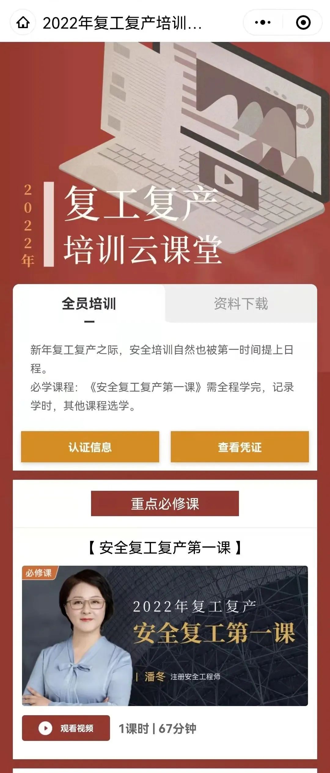 为做好常态化疫情防控下2022年节后复工复产安全培训教育工作,佛山市安委办、佛山市应急管理局于2月7日上线复工复产“云课堂”,免费提供18个小时线上课程、17个实用案例、33个课程、103份资料,积极引导全市企业(企业负责人、安全管理人员)、员工利用线上培训开展节后复工复产培训学习。