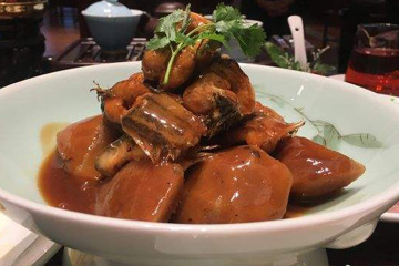 4、食前把柚皮回热放在鳝段上,扣在碟上,把原汁倒在镬中,加入湿生粉勾芡,淋在鳝上,撒上胡椒粉,放上芫荽叶设色。
