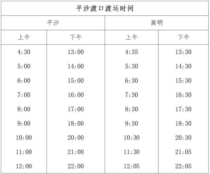 2月5日对平沙渡口渡运班次实施临时调整,延长渡船运营服务时间,末班船由21:05延长至22:05,具体调整如下: