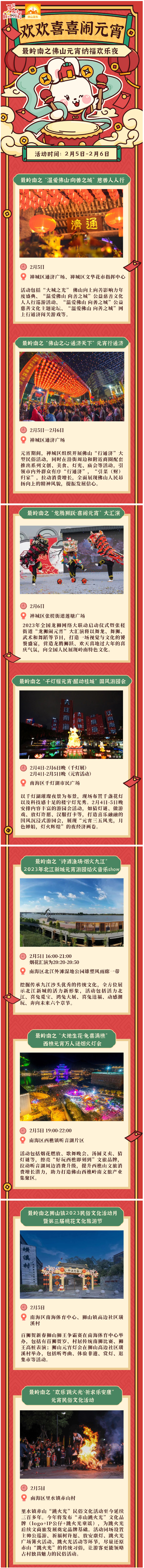 兔年元宵节即将到来,2023年2月5日—2月6日(正月十五、十六),佛山市开展“最岭南之佛山元宵纳福欢乐夜”系列活动,通过15项活动营造“行通济、无闭翳,睇烟花、好运势”的特色民俗节日氛围,底蕴深厚、新奇有趣的岭南文化盛宴,尽在佛山!