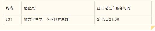 为满足市民观看烟花汇演,将延长公交631运营服务时间,末班车由20:30延长至21:30。