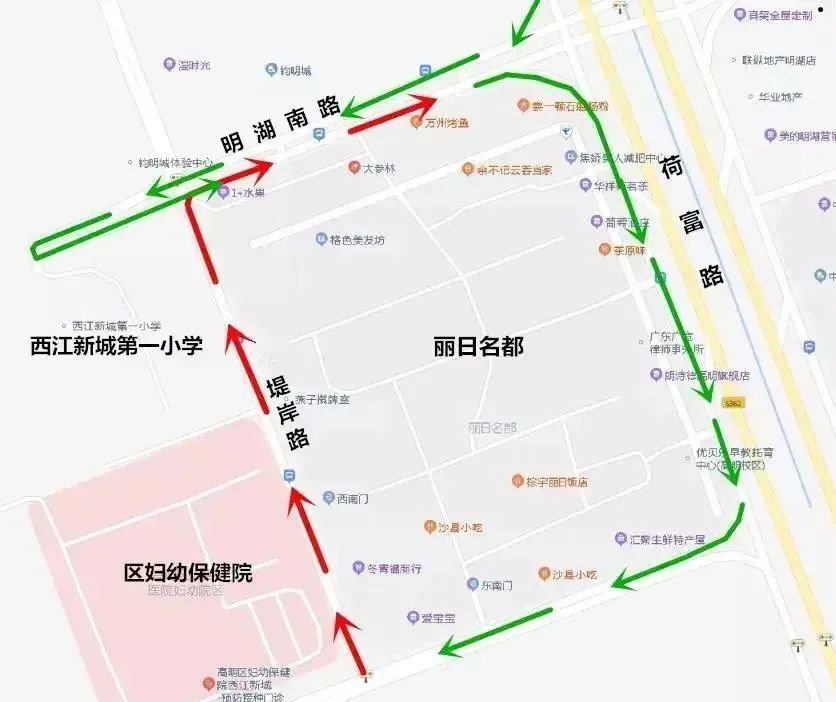 堤岸路(即丽日名都与妇幼保健院、一小之间约300米道路)交通管制期间,为南往北方向通行。