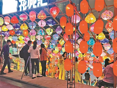 “在网上看到这里有很漂亮的鱼灯、汉服走秀和国风表演,节日氛围这么浓,让人忍不住来感受一下!”2月5日,汉服爱好者小刘约上几个朋友打卡商场最新推出的美陈,还现场体验了猜灯谜等节庆活动。