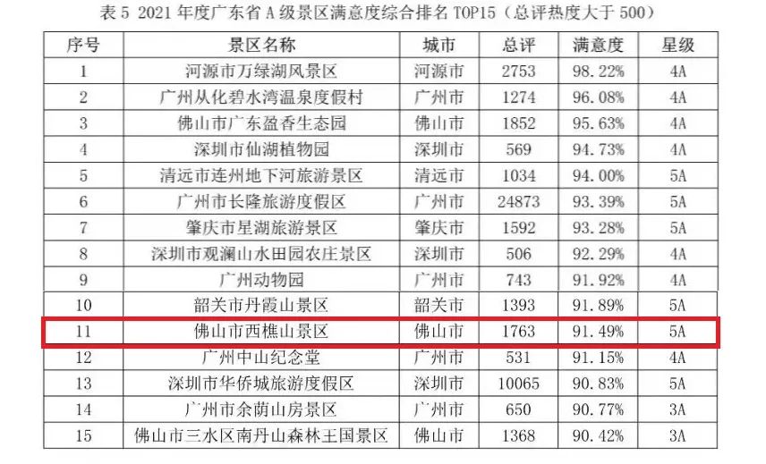 近日,广东省景区行业协会发布《2021年度广东省旅游景区游客满意度大数据调查报告》。报告显示,在全省5A级景区热度分布中,西樵山景区排名全省第5名;在满意度排名中,西樵山景区排名第11,满意度91.49%。