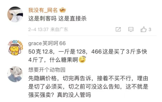 2月2日,重庆的蒋女士带着儿子去重庆磁器口逛街路过一家糖果店,品尝后选了4块牛乳派让店家称重算钱,店家却表示先切再算,并建议蒋女士再选一块,可以送一块。店家切完后称重,6块糖总价居然高达466元。蒋女士提出不要了,店家说是现切现卖的。最后她还是付了款。