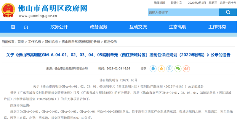 《佛山市高明区GM-A-04-01、02、03、04、05编制单元(西江新城片区)控制性详细规划(2022年修编)》在高明区政府网进行公示,至2023年3月4日结束,公示期共30天。公示期内,市民如对规划方案有任何意见或建议,可拨打0757-88232002,或通过电子邮件及邮寄信件等方式建言献策。