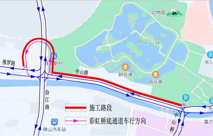 为提升中山公园片区道路通行条件,2月12日10时起,中山路(中山桥至汾江路段)、汾江路彩虹桥桥底通道部分车道将进行围蔽施工。具体交通组织调整情况如下: