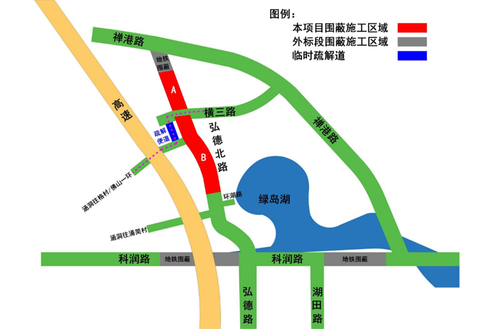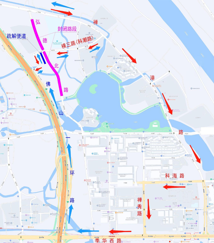 因禅城区南庄镇弘德北路改建施工需要,2月13日起,弘德北路(环湖路-禅港路)段封闭施工,其中横三路平交口不封闭保持通行,车辆可通过疏解便道前往湖涌格村及佛山一环。施工时段暂定为2023年2月13日起2024年7月18日,请过往车辆绕行到禅港路及佛山一环路。