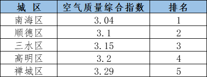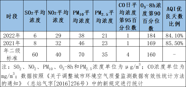 2022年佛山市二氧化硫(SO2)、二氧化氮(NO2)、可吸入颗粒物(PM10)、细颗粒物(PM2.5)平均浓度分别为6、29、38、21微克/立方米,一氧化碳(CO)日平均浓度的第95百分位数为1.0毫克/立方米,臭氧日最大8小时滑动平均(O3-8h)浓度的第90百分位数为184微克/立方米。按照空气质量指数(AQI)评价,全市优良天数占全年有效天数的84.1%。