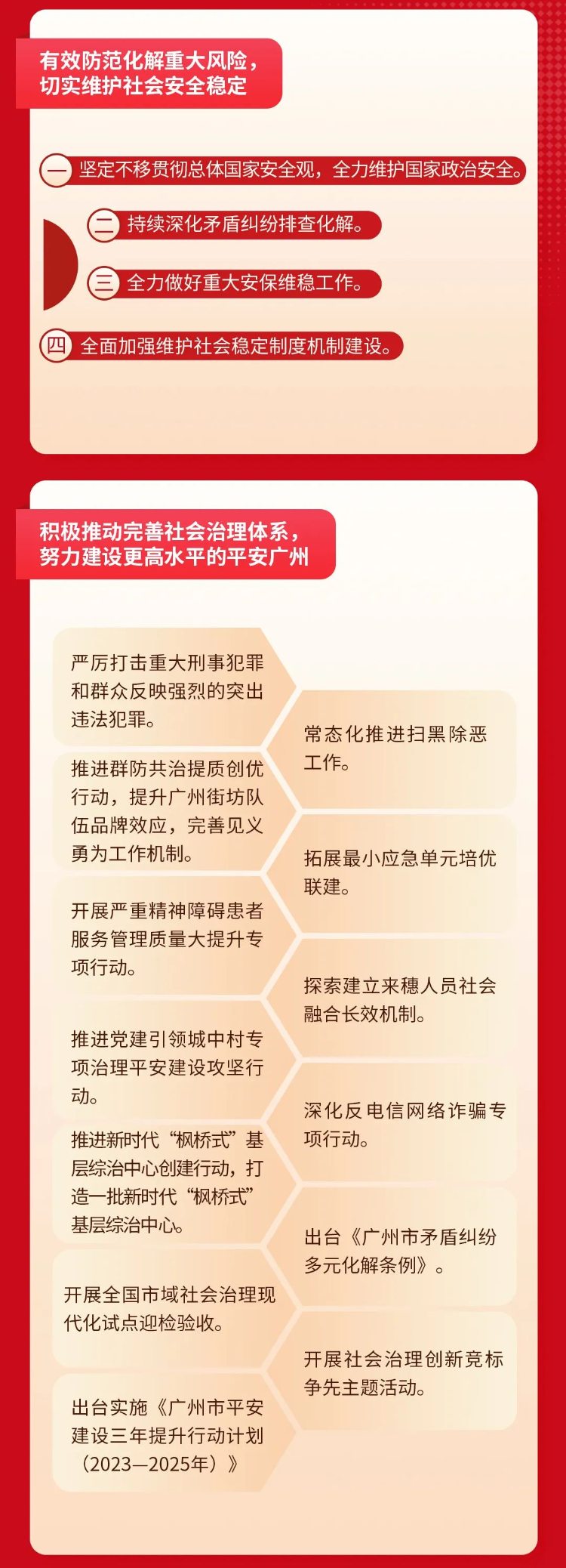 会议强调,全市政法系统要深刻认识高质量发展是政法工作现代化的内在动力,服务高质量发展是政法工作中心任务,准确把握政法工作现代化的基本工作原则和方法路径,确保广州政法工作现代化始终沿着正确方向稳步推进。要全面加强党的政治建设,忠诚拥护“两个确立”、坚决做到“两个维护”;要有效防范化解重大风险,切实维护社会大局稳定;要积极推动完善社会治理体系,努力建设更高水平的平安广州;要发挥法治固根本、稳预期、利长远作用,更好服务保障高质量发展;要深入推进政法改革和创新,激发广州政法工作现代化动能;要持续深化政法队伍专业化建设,锻造堪当重任的广州政法铁军,切实以政法工作现代化服务保障高质量发展。