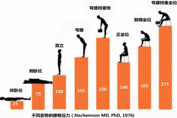 首先给大家看一组数据,在不同的姿势下,腰椎承担着不同的压力,其中仰卧位时腰椎承担的压力最小,侧卧位次之。这很好地解释了医生们会建议腰椎间盘突出的患者在急性期尽量卧床休息的原因,因为这样能减轻患者腰椎的负担。从数据上可以看出,人在弯腰时腰椎所承受的压力至少是直立状态时的1.5倍,随着弯腰角度以及负荷量的增大,腰椎承受的压力可以增加至2.2-2.7倍。因此可以得出结论:想保护腰部,尽量少弯腰。