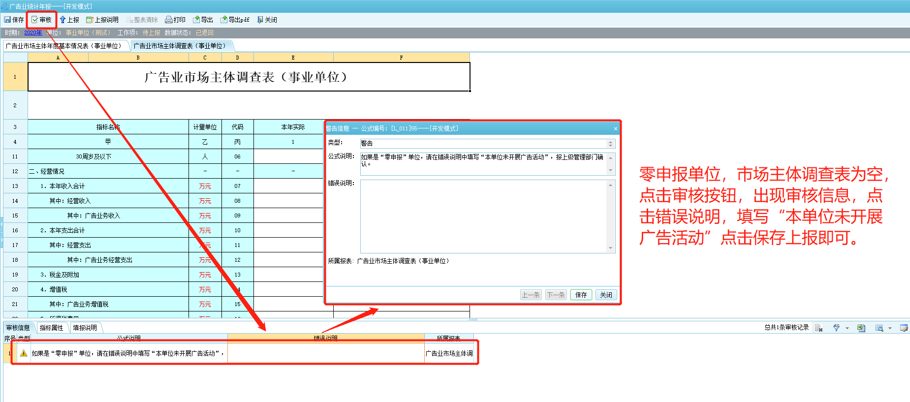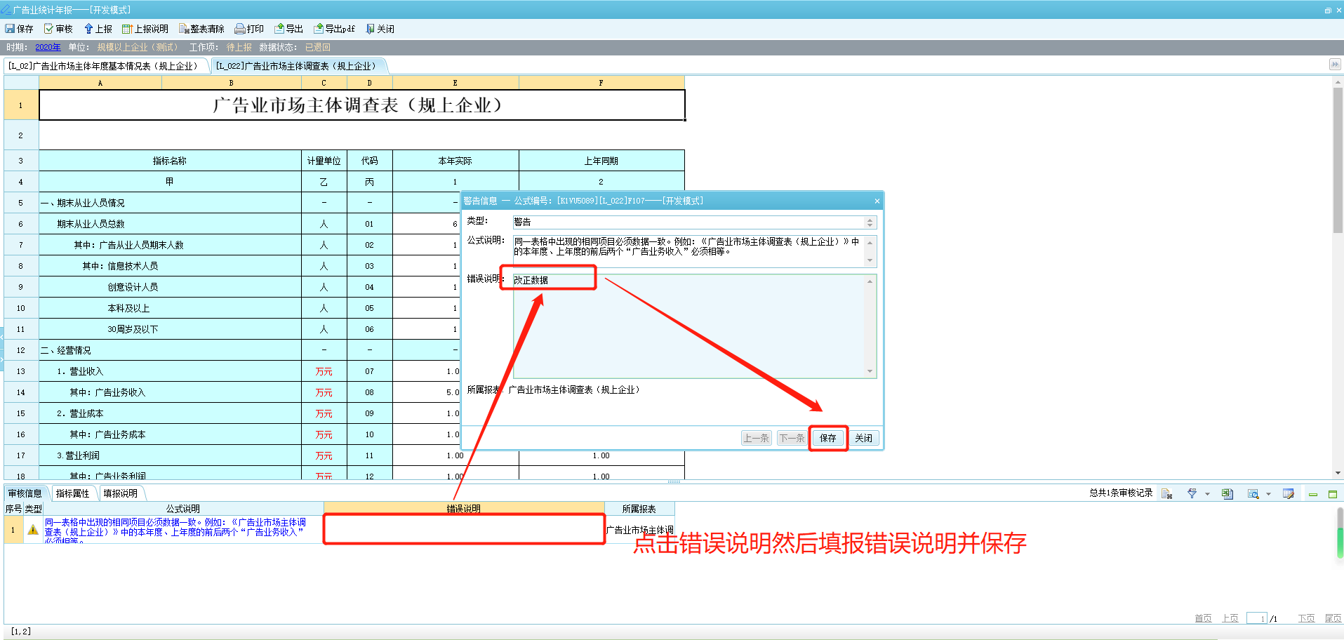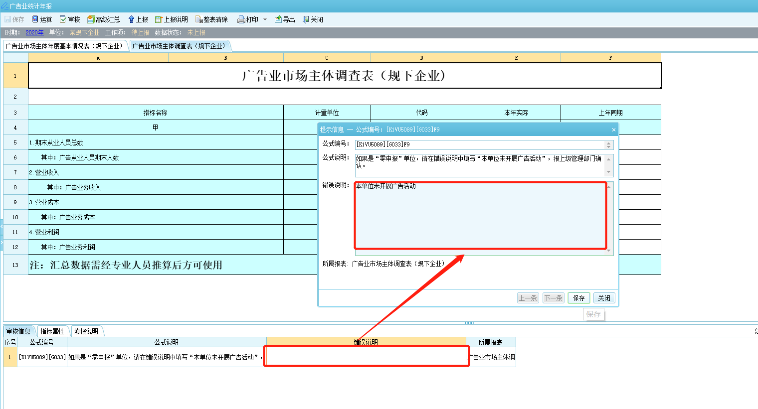 双击错误说明,会弹出错误说明的提示框,在错误说明中填写“本单位未开展广告活动”,点击保存,上报即可。