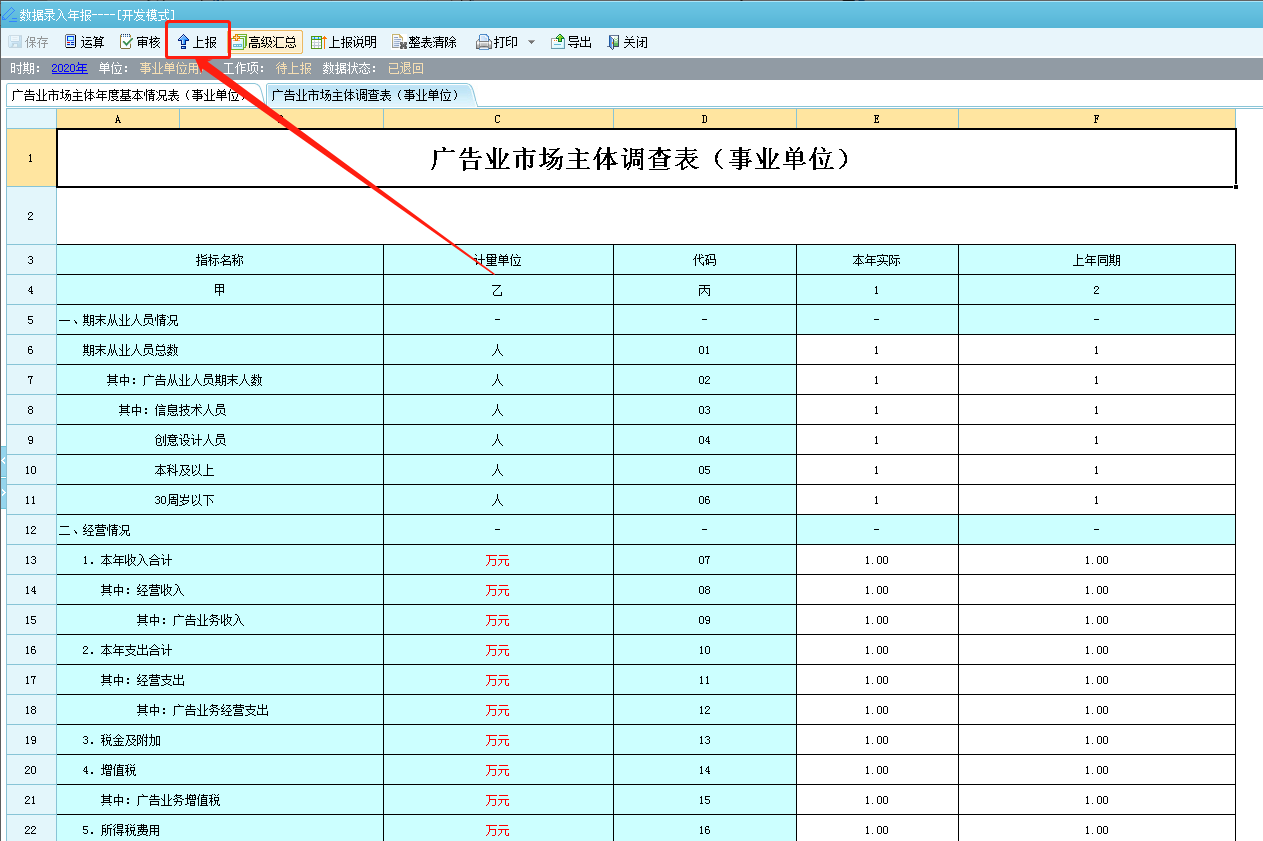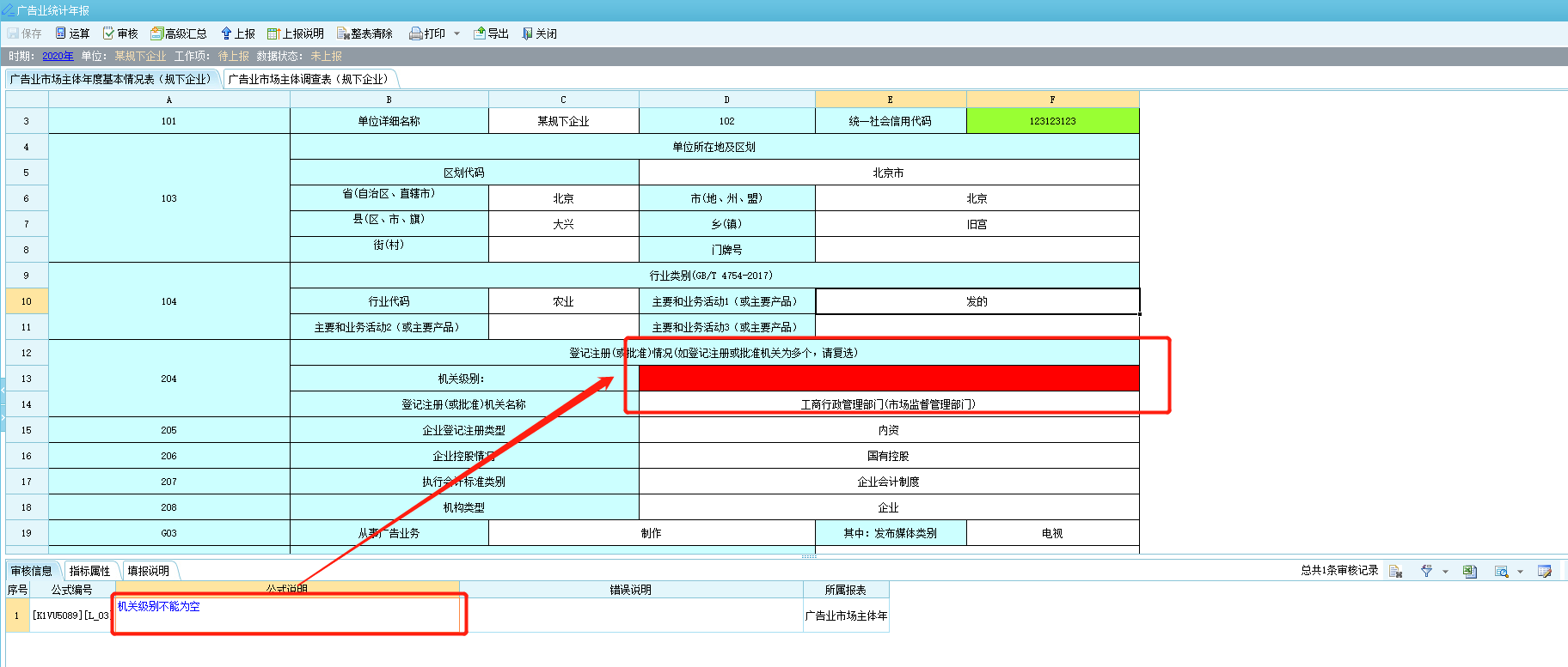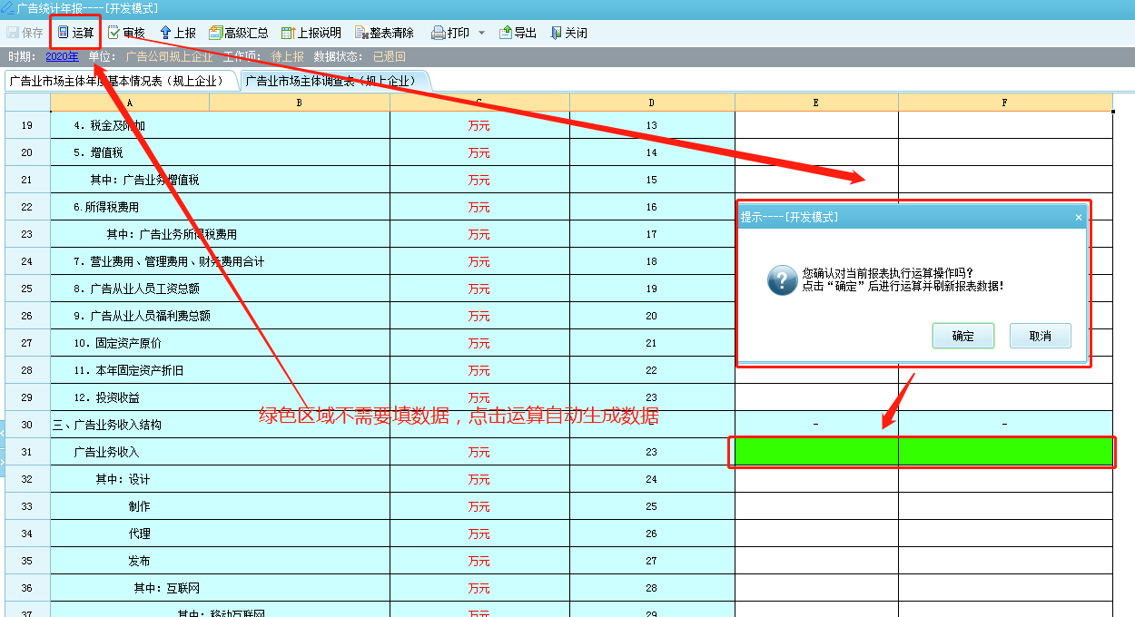 点击功能栏上的【广告业统计年报】,或者点击首页常用功能里的数据采集,进入报表填报界面。表格中绿色单元格为运算单元格,无需单独填写,可自动运算生成。表底有具体的审核运算关系。