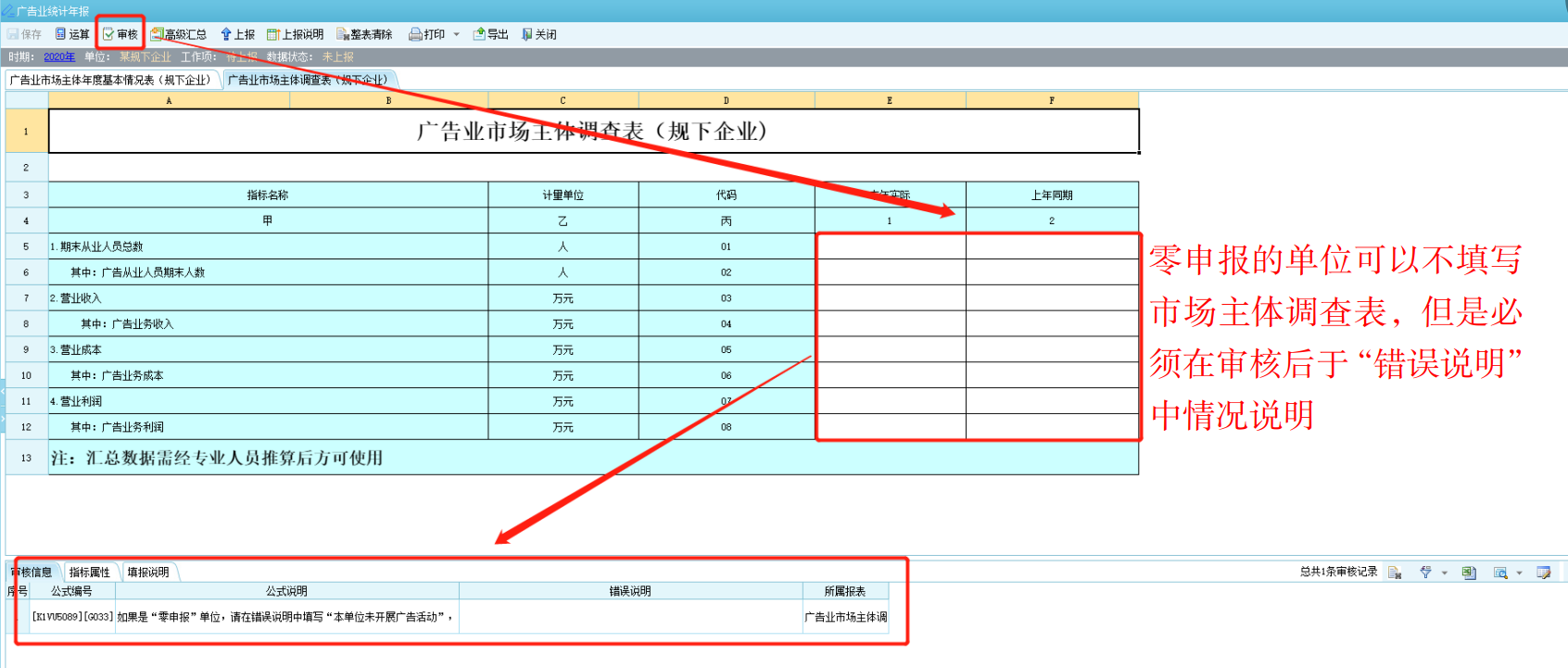 企业经营范围含广告,本年度实际未开展广告业务的,可以零申报。零申报的单位,需要填写广告业市场主体年度基本情况表,可以不填写市场主体调查表,但是必须审核后填写情况说明(操作方式同上文“错误说明”)。