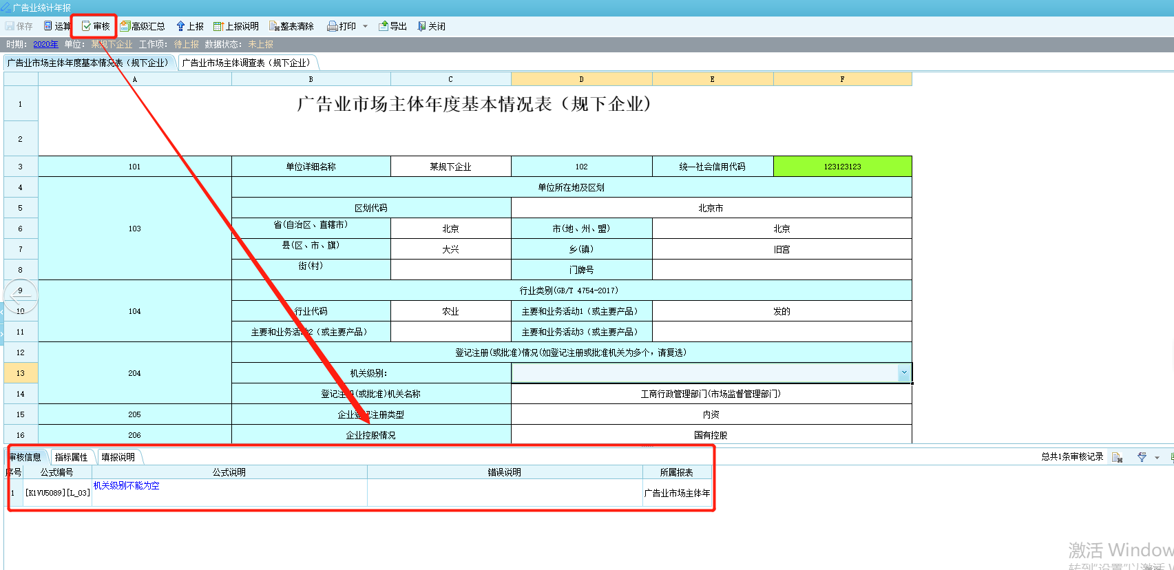 数据运算后,需要将报表的数据进行审核,点击工具栏中【审核】按钮(注意这里是逻辑性审核,如果逻辑性审核不通过,则不能上报),若数据无异常则提示审核通过。