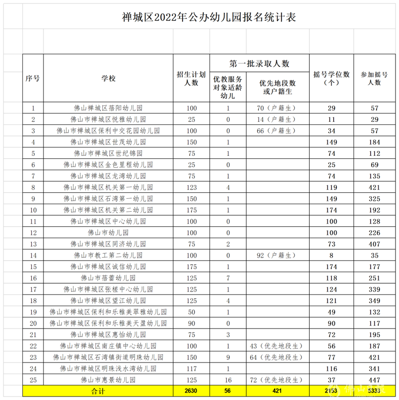 据了解,禅城区2022年25所公办幼儿园共招生2630人,其中优教服务对象适龄幼儿56人,优先地段生或户籍生421人,摇号学位数2153人,共计5333名适龄幼儿符合摇珠资格。相比去年公布的表格,今年禅城区新增了5所公办幼儿园对外招生,摇号学位数增加了511个。