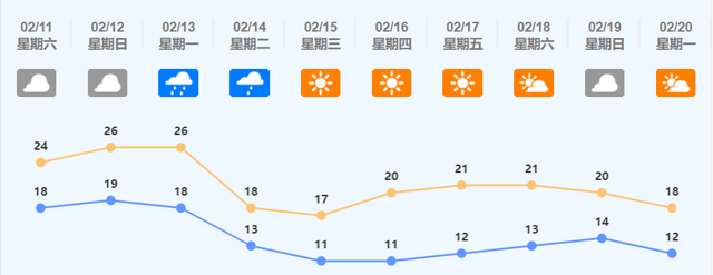 13日:阴天,有小到中雨,早晨有轻雾,18~26℃,东南风2级转偏北风3级;