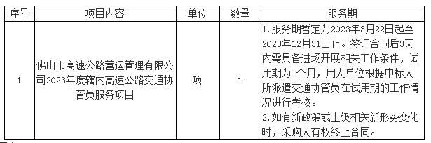 1、标的名称:佛山市高速公路营运管理有限公司2023年度辖内高速公路交通协管员服务项目