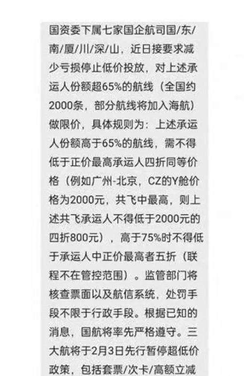 网传中国国航、中国东航、南方航空于2月3日先行暂停超低价政策,并于2月6日凌晨按指导调舱。