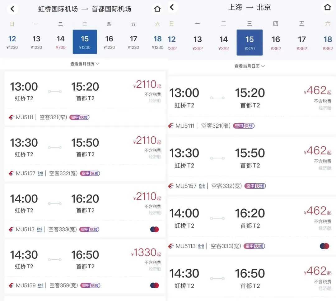 2月3日上海虹桥-北京首都机场航线价格最低不到500元。2月15日涨到了610元至2150元不等。