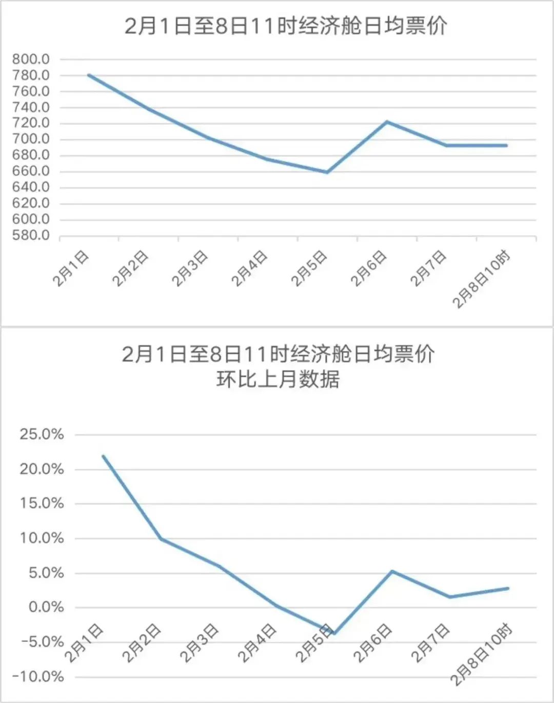 飞常准机票数据显示:2月1日至5日国内机票价格稳步下降,2月6日至7日国内机票价格开始上涨,国内经济舱平均票价(不含税)从750元左右涨到850元左右。