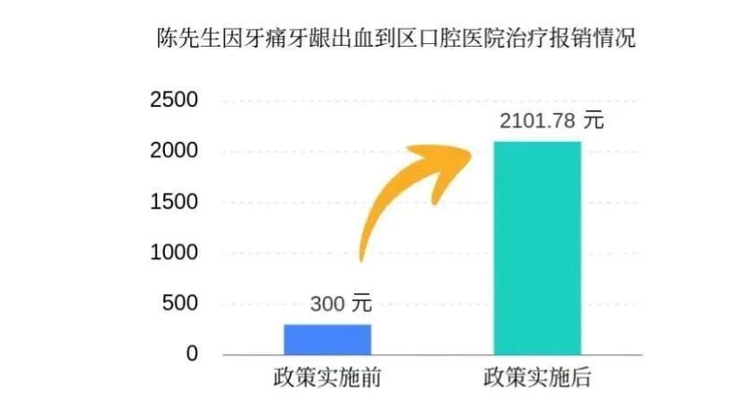 2022年12月6日,陈先生因牙痛、牙龈出血到某区口腔医院治疗,当次就医做了检查和牙体修复术等治疗,医保报销了2101.78元。如按旧政策,当次报销就300元;按新政策出台后,多报销了1801.78元。