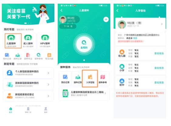 具体操作方式如下:打开“粤苗APP”,绑定儿童信息后在首页点击“儿童接种”——“入学查验”。