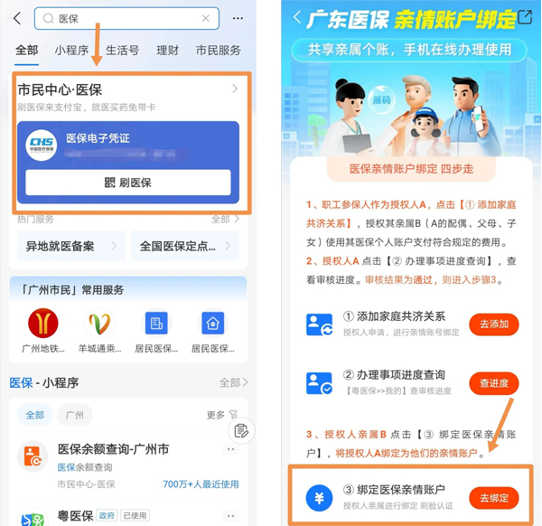 步骤1:参保人在支付宝或微信“粤医保”小程序绑定亲情账号后,被绑定的家属可直接在支付宝APP上搜索“医保”,点击进入医保电子凭证渠道,找到【精选服务】—【医保亲情账户】;进入“亲情账户绑定”指引页面后,选择③【绑定医保亲情账户】。