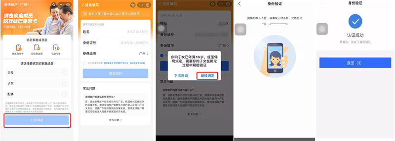 步骤2(该步骤为家庭成员选择职工参保人进行绑定):选择要绑定的家庭成员——填写绑定家人信息(姓名、身份证、参保地)——被绑定的家庭成员进行刷脸身份认证——认证成功。