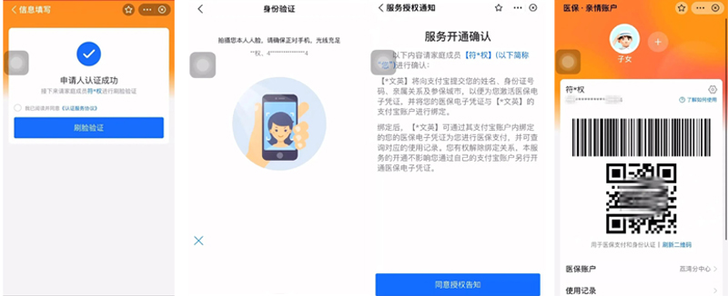 步骤3:接下来由参保人进行刷脸身份认证——认证成功——服务开通确认,点击“同意授权告知”。授权成功后,家庭成员可展示职工参保人医保电子凭证进行代扣。